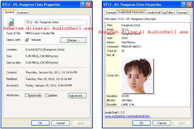 Silahkan download freeware AudioShell diSINI trus instal di komputer kamu. Lansung jalan deh programnya. Ketika ingin edit tag mp3 nya tinggal klik kanan file mp3 nya dan pilih properties. Perhatikan ada perubahan pada properties sebelum dan sesudah terinstal AudioShell ini. Jadi form edit akan lebih banyak dan tinggal ganti saja sesuka kalian. Mau diisi foto, alamat blog, nama pacar juga boleh…
