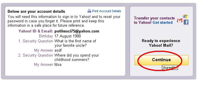 - Kalau informasi yang anda masukkan sudah yakin, klik pada Tombol Kuning Bertuliskan Create My Account Jika kolom isian formulir pendaftaran kamu mengisi dengan benar, maka jendela konfirmasi akan muncul seperti dibawah ini dan lanjutkan dengan meng-Klik tombol Continue.
