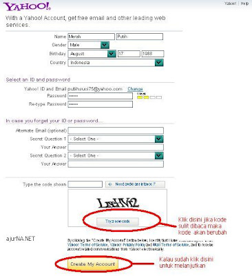 Masukkan code capta pada kolom yang disediakan, maksudnya yahoo meminta memasukkan code seperti itu adalah untuk menjaga keamanan server yahoo dari mesin spam. dan untuk meyakinkan bahwa yang mendaftar adalah manusia. jika code capta sulit dibaca, klik klah icon dua panah bengkok di sebelah kiri kode capta. maka nanti kode capta akan berubah menjadi bentuk yang lain. jika masih sulit, klik lagi sampai gampang dibaca.