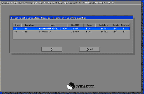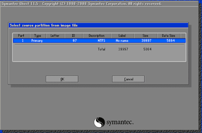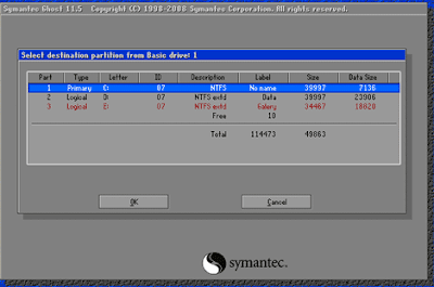 - Setelah itu terlihat partisi yang akan kita timpa atau restore windows, kalau windows yang sebelumnya diinstal di partisi C maka restore yang kita lakukan harus di partisi C ( jangan salah memilih partisi karena salah memilih partisi akan membuat data hilang karena sifatnya memformat partisi dan mengembalikan restore windows ke partisi yang dipilih ) Lalu klik OK
