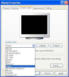 - Setting pada pilihan screen saver (pada layar desktop klik kanan pilih properties) dan pilih matrix lalu OK. Setting juga waktunya berapa menit komputer kamu akan menjalankan screensever tersebut.